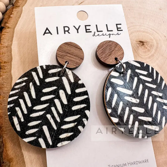 Abstract Boho Lines Cork + Leather Wood Round Earrings